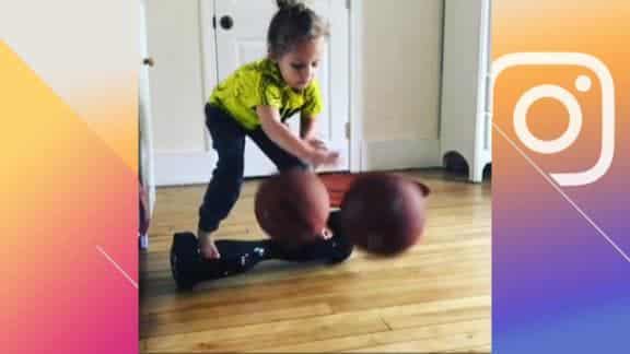 Cette fille, appelée Mini Mika, peut dribbler deux ballons de basket en même temps en restant debout sur l’hoverborad.