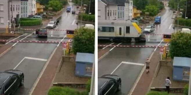 Ce conducteur est coincé sur un passage à niveau alors qu’un train est sur le point de passer. Il en a fallu de peu et il serait réduit en miette avec sa voiture car le choc a été très violent.
