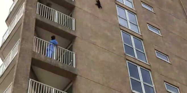 Un raton laveur qui s’accroche à un mur haut de 10 mètres sur ce bâtiment et tombe… tout en se receptionnant parfaitement. Incroyable !