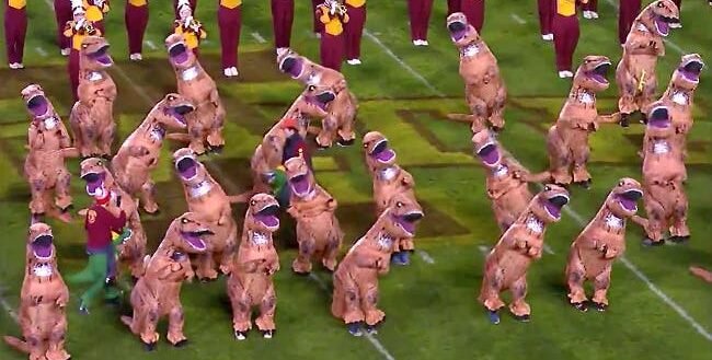 C’est durant la mi-temps du match Iowa State-West Virginia que la fanfare ISU a interprété le thème classique de John Williams, tiré du succès spectaculaire du dinosaure de Steven Spielberg, en l’honneur du 25e anniversaire du film et a ajouté des dinosaures qui dansaient à l’occasion. Ce n’est pas la première fois que cela s’est produit. L’année dernière, la fanfare de l’Université du Michigan a réalisé un spectacle similaire, qui est resté mémorable auprès des téléspectateurs.