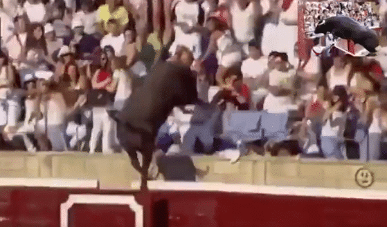 Le spectacle a viré au drame pour ces personnes venues nombreuses pour assister à une tauromachie. Dans l’arène, le taureau se met à courir. D’un coup de tête et très furieux, l’animal saute au-dessus de l’enclos qui le sépare du public. Il saute et atterrit sur les gradins. Dans un accès de rage, le taureau s’en prend à ceux qui se trouvent sur sa route. Certains tentent de tirer sur sa queue, mais ne font qu’attiser la colère de cette énorme bête. La scène est désolante, avec un animal effarouché qui cherche désespérément de se libérer de son enfer.