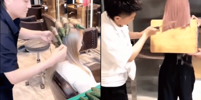 Vous avez sûrement déjà essayé un salon de coiffure qui vous propose un espace deux en un. Vous disposez d’un coin snack ou thé et café pour prendre un petit encas le temps d’attendre votre tour. Ce concept est déjà assez répandu. Dans cette vidéo, vous avez toujours le mix coiffure et cuisine, mais cette fois-ci vous allez être surpris par les techniques utilisées. Les courgettes servent de rouleaux pour réaliser des boucles tout en les cuisant. Les pics à brochette sont fixés sur les cheveux, un couteau de cuisine et un plateau deviennent des instruments pour faire une belle coupe. Découvrez des procédés qui peuvent vous séduire ou non.