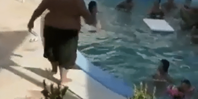 Cet homme en surpoids n’a pas du tout envie de ménager les personnes dans une petite piscine de ce complexe. Avec un short, il se dirige tout droit dans ce bassin, assez minuscule, où une dizaine de personnes se baignent. D’un air très rassuré, celui-ci plonge le dos en premier et éclabousse tous les nageurs. Ils n’ont eu le choix que de crier, d’autres se sont même mis à fuir. L’idée n’est pas du tout bête pour pouvoir chasser tout le monde et avoir la piscine rien que pour lui. C’est la panique totale et la scène est hilarante !