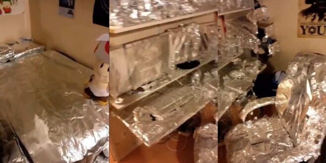 Elle a donc emballé entièrement sa chambre en utilisant 200 mètres de papier aluminium. Elle n’a littéralement rien laissé; le bureau, le lit, la chaise, l’ordinateur, les trophées, etc.