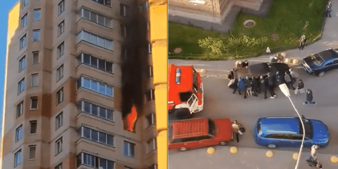Sur une rue menant vers un immeuble en feu, un camion ne parvient pas à passer. Une voiture mal garée bloque le passage. Des dizaines de personnes décident de la soulever ensemble.