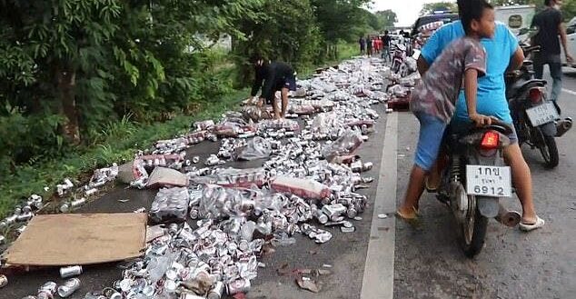 Samedi dernier, de nombreuses personnes se sont rué sur une route de Chumphon, dans le sud de la Thaïlande, afin de ramasser des canettes de bière.