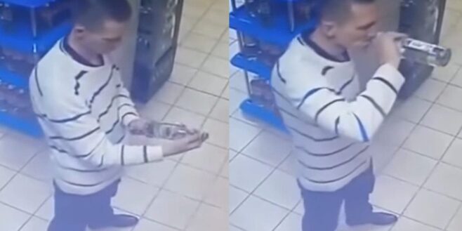 Un homme de Vladivostok, en Russie, a été filmé dans un magasin, buvant toute une bouteille de vodka et s’en va sans payer. Et ce n’était pas la première fois qu’il fait ça! Un des employés des magasins a dit qu’ils ont même dû appeler une ambulance une fois, car l’homme s’est effondré après avoir bu toute la bouteille.