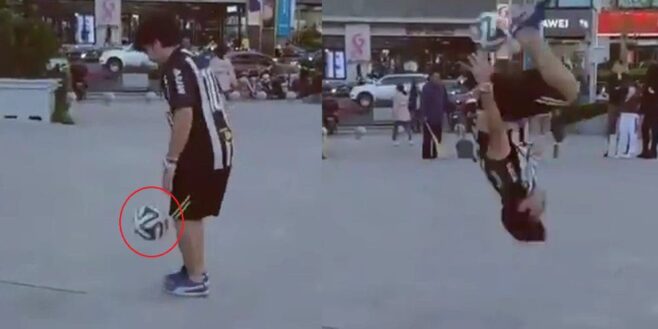 Il a pu faire un salto arrière sans que le ballon tombe par terre. Le ballon a, en effet, été jeté en l’air et est ensuite tombé sur son dos. C’est super impressionnant !