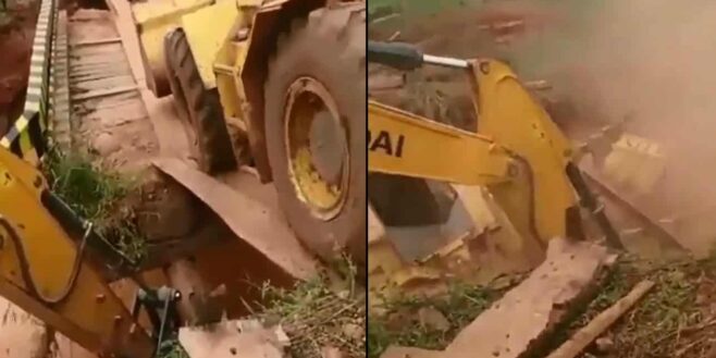 Un ensemble d’employés n’ont clairement pas bien réfléchi quand ils ont décidé de faire passer un grand tracteur depuis un pont mal construit.