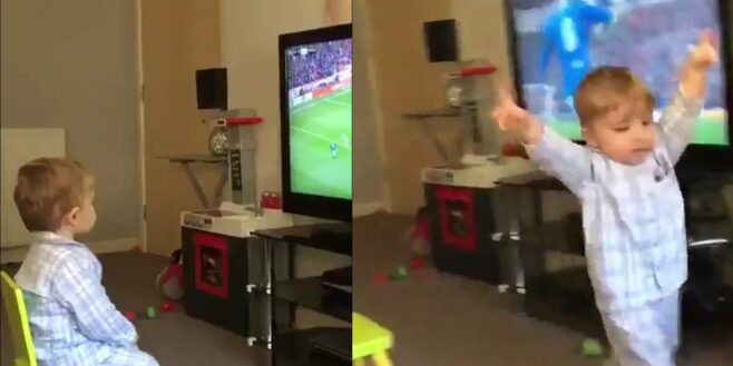 Un papa a filmé en vidéo son petit garçon qui ne dépasse pas les 3 ans d’âge, regardant un match. Quand son équipe préférée marque un but, il a commencé à courir partout dans la chambre exprimant sa joie.