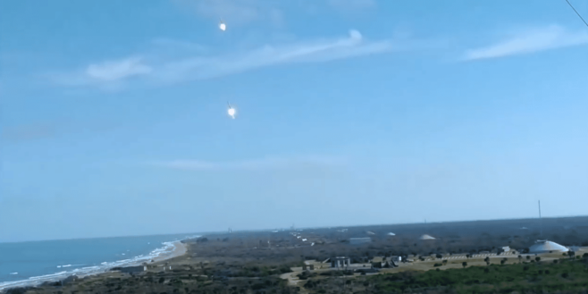 Après avoir parcouru 60 km en hauteur et atteint 6900 km/h, les propulseurs atterrissent. Avant cela, ils ont brulé et ils ont produit chacun un bang supersonique impressionnant que nous montrent ces images.