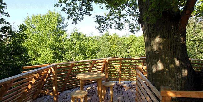 La petite maison de l’arbre est accessible à partir d’une plate-forme suspendue sur un autre grand chêne à trente mètres. De cette plate-forme, il y a une passerelle en bois, qui se situe à dix mètres du sol et mène directement au cœur du nid.