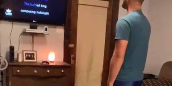 Chantant joyeusement dans son salon, cet homme a été surpris par sa femme au beau milieu de sa prestation, il a alors poussé un cri qui fait rire.