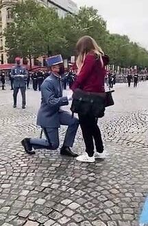 La photo est belle et la demande unique. Un officier militaire a surpris sa compagne en la demandant en mariage sur les Champs Elysées juste avant le défilé militaire.