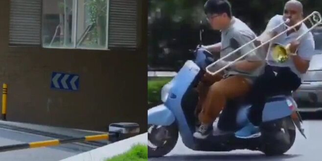 Mais, on a en réalité eu une farce par deux hommes hilarants qui ont utilisé un trombone pour imiter le son de la moto alors qu’ils conduisaient un scooter !