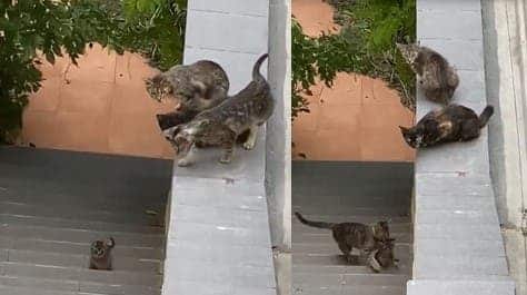 Cette touchante vidéo nous montre des chats qui s’entraident. Alors qu’un chaton est tombé du toit, une chatte est venue la secourir sous le regard de leurs compagnons.