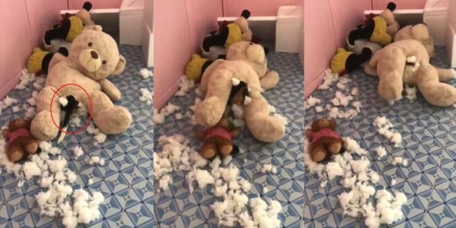 Ce qu’il a fait à ce pauvre nounours va certainement vous choquer ! Il a réussi à le déchirer et faire un grand trou entre ses jambes. Dans la vidéo, on voit le chat coincé dans le trou entre les jambes du nounours essayant de sortir. Et ce n’est pas du tout beau à regarder !