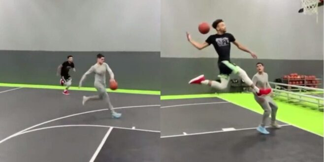 Deux jeunes basketteurs nous donnent un magnifique show avec leur incroyable talent ! Ils réalisent ensemble un panier de Basketball.
