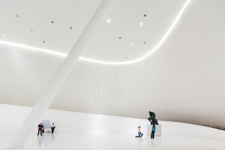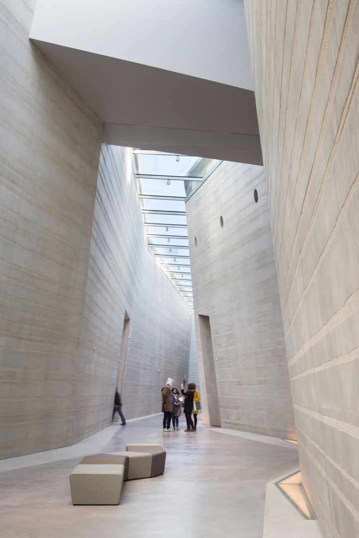 Il se démarque par son toit en verre incliné, en forme de voile, où filtre une douce lumière emplissant le musée d’une atmosphère sereine