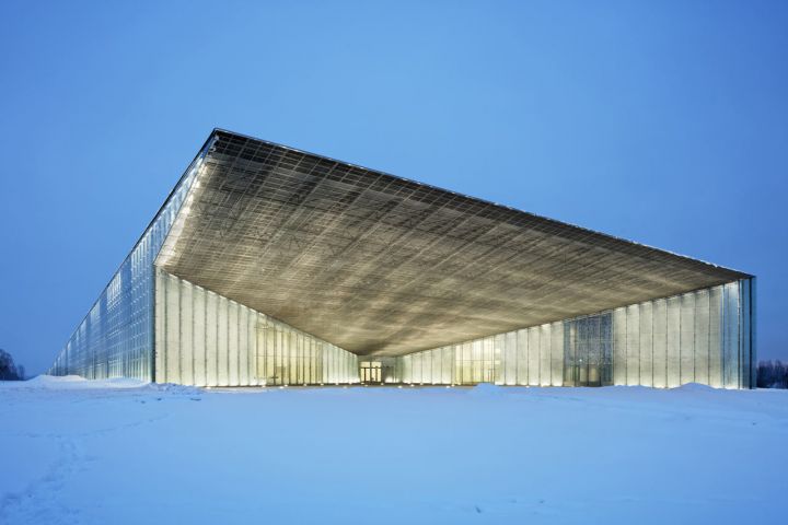 Le cabinet d’architecture n’a toutefois implanté l’édifice sur le site désigné, mais sur une ancienne base militaire soviétique. Le toit de verre semble s’élever vers le ciel, comme la piste d’un avion.