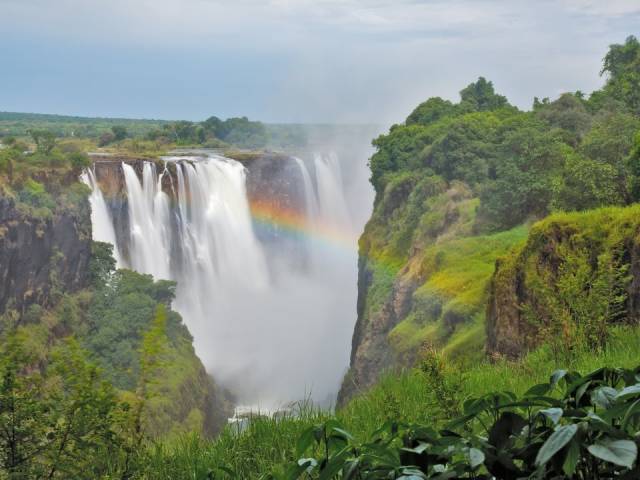 La chute Victoria se trouve à la frontière entre la Zambie et le Zimbabwe. Elle crée souvent des arcs-en-ciel au milieu de la brume et de la forêt tropicale environnante.