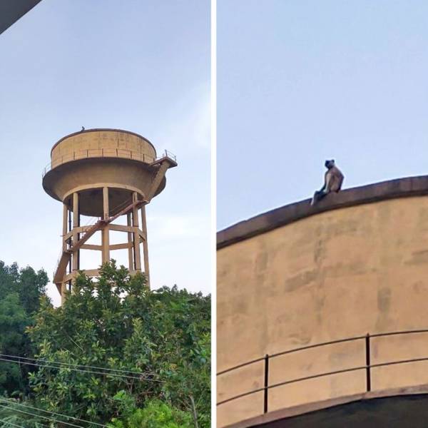 Un singe au sommet d’un réservoir d’eau