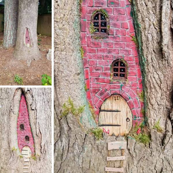 Fatiguée de voire cette vieille cicatrice dans son arbre, alors son propriétaire l’a transformé en maison de fées.