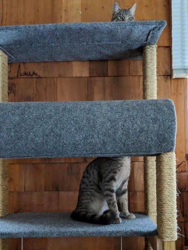 Le chat a laissé sa tête sur l’étagère du haut.