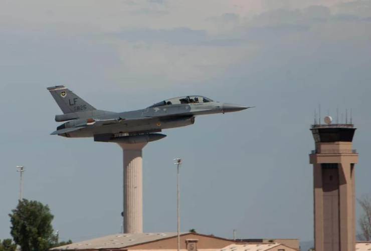 Un avion de chasse perché sur un piédestal