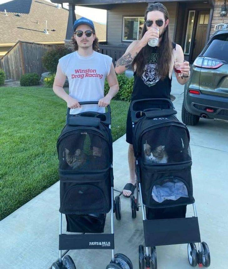 Juste 2 gars qui promènent leur chat en poussette