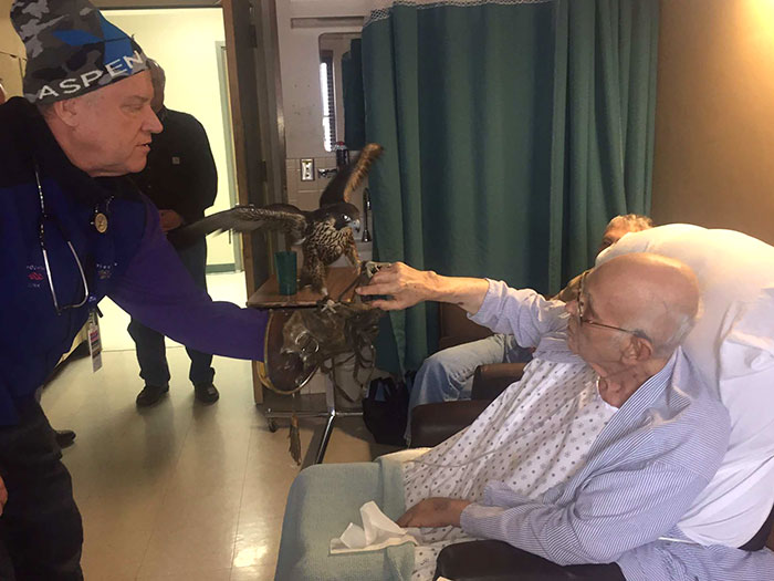 # 26 Dernière photo de mon grand-père, il est décédé quelques jours auparavant. Le docteur était un fauconnier et a amené son faucon à l’hôpital.