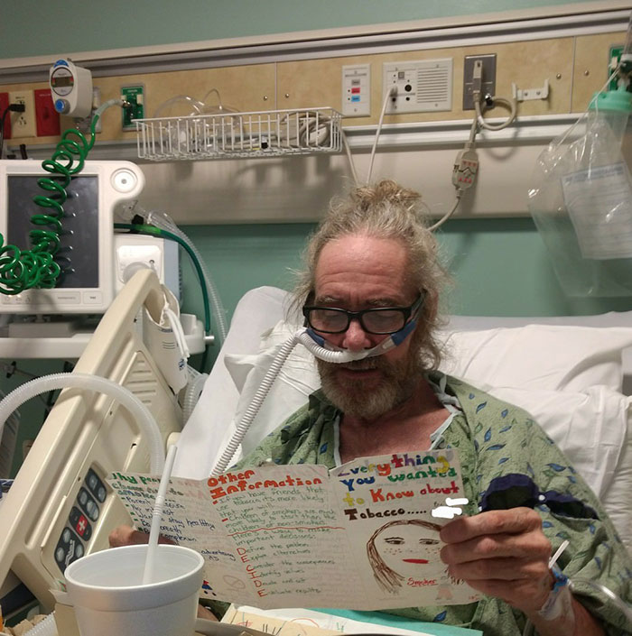 # 38 Mon père, à l’hôpital en train de mourir d’emphysème, lisant une brochure anti-tabac que je lui ai faite quand j’étais enfant.