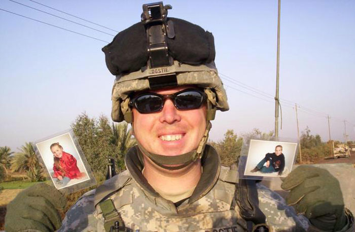# 43 Mon père, Shawn Dostie, SFC, brandissant des photos de ma sœur et moi.