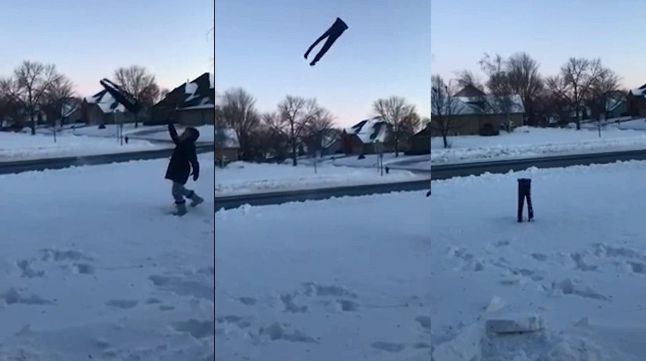 En profit du temps, Danika et sa famille ont pensé à essayer de faire une expérience. Ils ont jeté un pantalon gelé en l’air et ce dernier, à cause du froid glacial, il a atterri tout en se tenant debout !