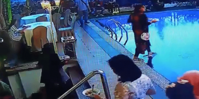 Filmée par la caméra de surveillance du restaurant, cette jeune femme s’avance tout droit vers la piscine et ne s’aperçoit même pas qu’elle a déjà un pied sur l’eau. Voilà comment elle s’est retrouvée dans la piscine et heureusement pour elle, que celle-ci n’ait pas été très profonde. Elle va devoir se resservir pour son dîner.