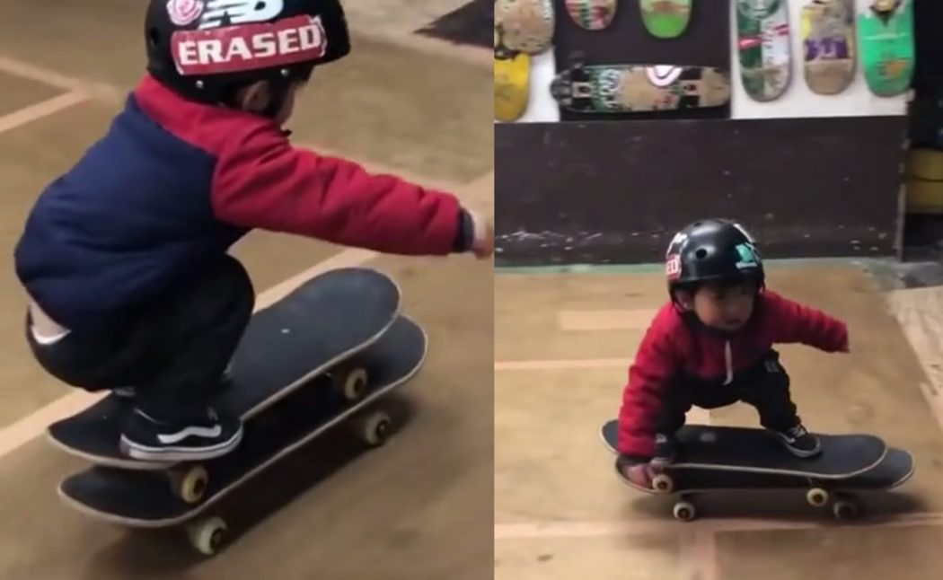 Malgré son très jeune âge, il maintient proprement son équilibre sur la planche. Il a même sauté une grande distance de l’escalier à la planche à roulettes sans tomber par terre.