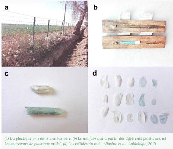 Des chercheurs argentins ont observé que les abeilles sauvages du genre Megachile avaient fabriqué un nid entier avec de déchets plastique. Habituellement, les insectes utilisent divers matériaux : des pétales de fleurs, des feuilles, du bois, de la boue ou encore de la résine, pour façonner le nid.