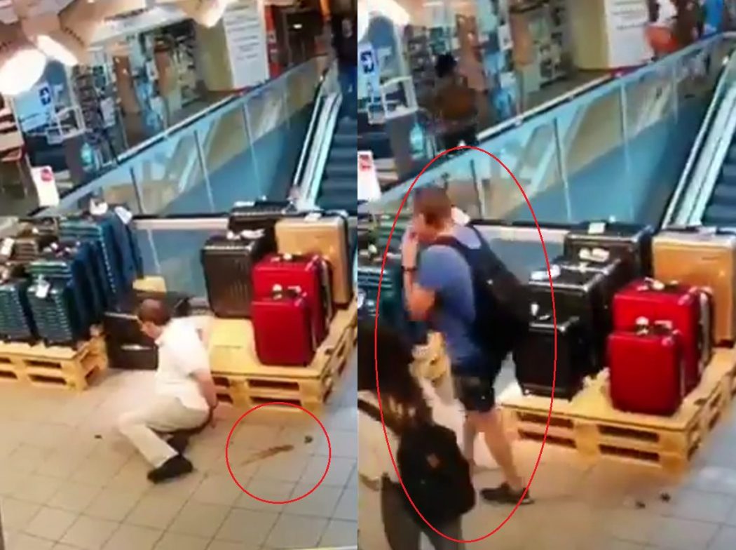 Cette scène dégoûtante s’est passée dans un grand centre commercial. Un homme marchait tranquillement quand il s’est soudainement glissé et a tombé par terre.