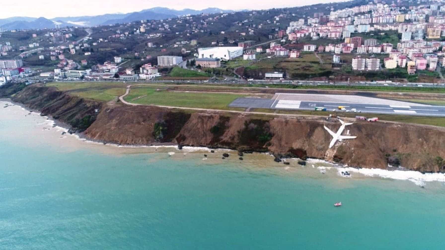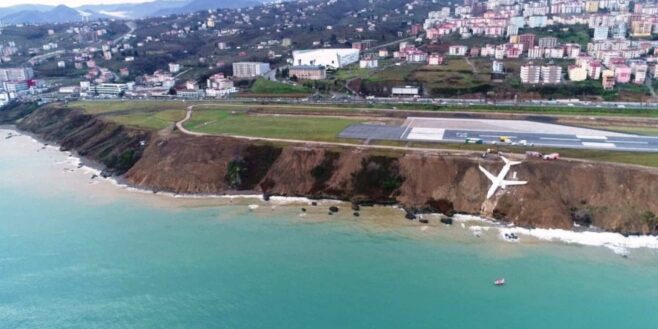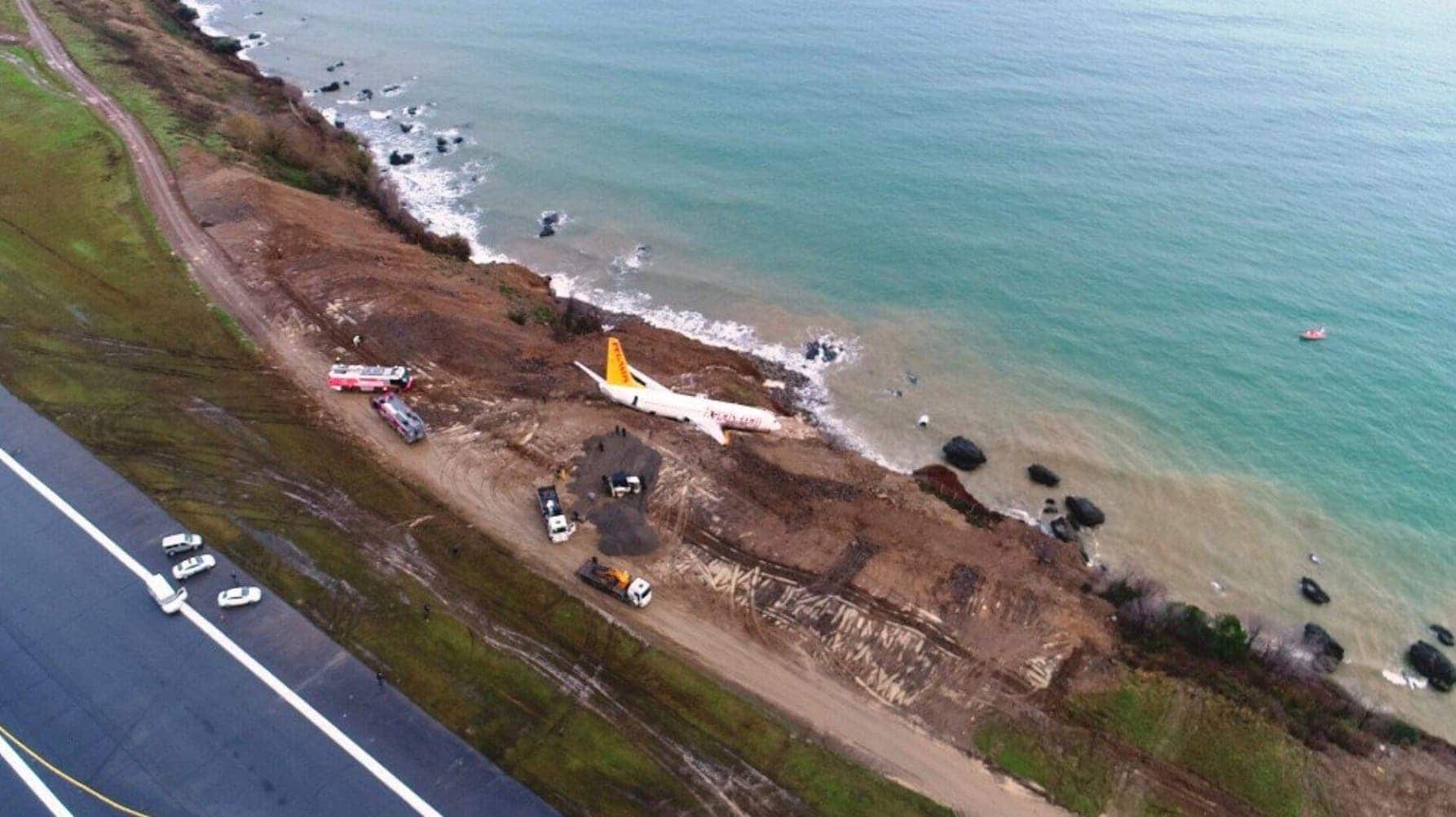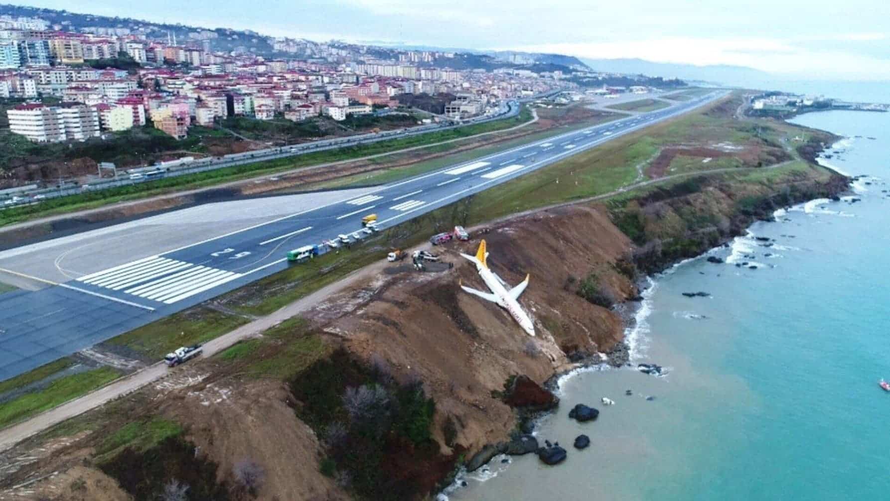 L’avion de Pegasus Airlines a dérapé hors de la piste à l’aéroport de Trabzon en ratant son virage et finissant sa course dans la falaise près de la mer.