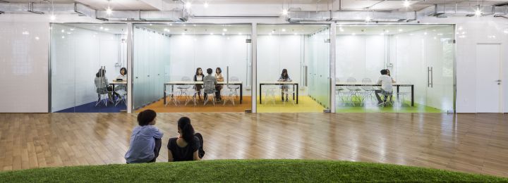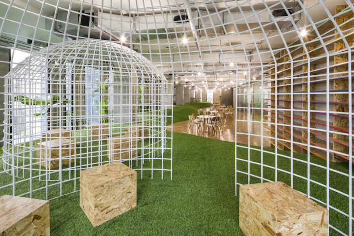 Dans les nouveaux locaux tout a été conçu pour stimuler le bien-être. Les plantes ne sont pas artificielles mais vivantes afin de donner le sentiment d’être dans un parc. De grandes fenêtres afin de laisser passer la lumière, des monticules de pelouse pour servir d’espace de détente ou de réunion.