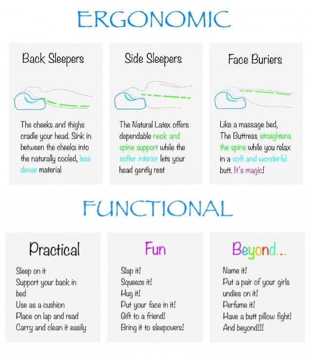 Il est livré avec une housse d’oreiller noir, aqua ou en spandex blanc. Si vous voulez avoir l’air bizarre, et lui donner un air plus familier, vous pouvez habiller votre Buttress avec vos propres sous-vêtements.