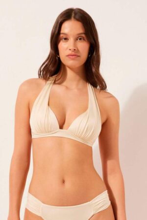 Cette structure douce permet de galber la poitrine. Il permet aussi de créer un décolleté naturel et flatteur. Le soutien s’ajuste grâce à des bretelles fines qui se nouent dans le cou et dans le dos. Cela assure un maintien personnalisé, sans armatures ni éléments rigides.