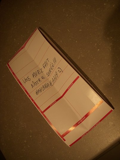 Au lieu de laisser une contravention à Simon, ils ont laissé un gentil mot « Vous avez fait notre soirée hahahaha 🙂 ».
