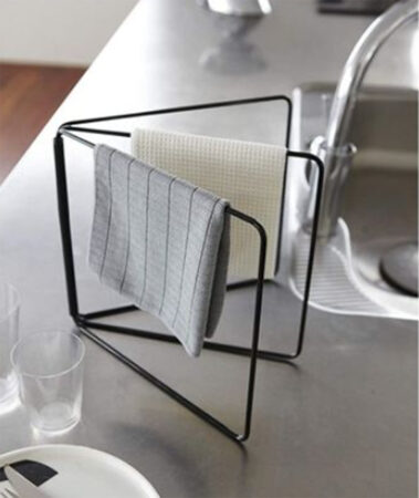 Découvrez ce petit porte-serviettes en métal noir à poser sur le comptoir de la cuisine. Sa forme en éventail offre trois portants sur lesquels poser vos serviettes et chiffons pour faire la vaisselle ou le ménage.
