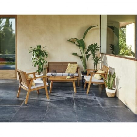Mais aussi à ce mobilier outdoor qui s’invite à point nommé chez vous pour vos futurs repas pris sur votre terrasse ou balcon. Ces meubles en bois d’acacia et fibre synthétique se composent d’une table basse, d’un canapé deux places, ainsi que de deux chaises.