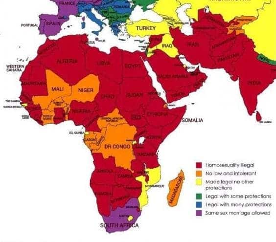 Les territoires marqués en rouge sur la carte sont les endroits en Afrique, au Moyen-Orient ou en Asie qui criminalisent l’homosexualité.