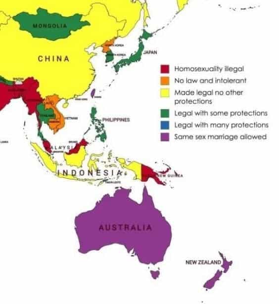 La carte, qui à première vue ressemble à n’importe quelle autre carte du monde, représente les pays les plus hostiles et les plus tolérants envers les personnes LGBT. Avec l’introduction constante de nouvelles lois, comme en Indonésie avec un texte criminalisant l’homosexualité, les voyageurs LGBT sont invités à la consulter avant tout projet de départ.