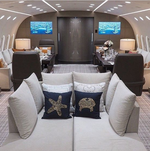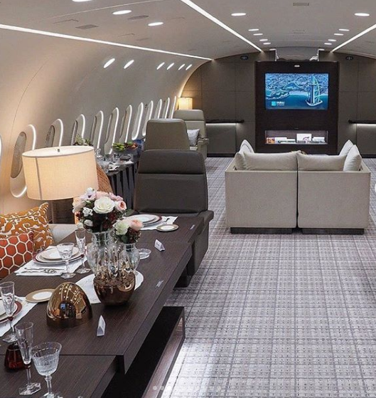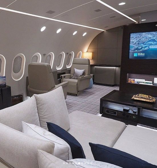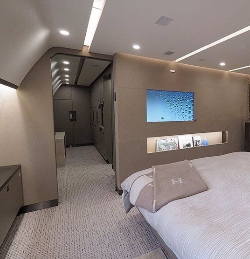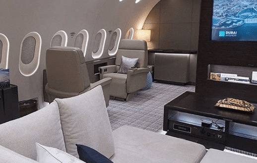 Il s’agit d’un avion privé, un Boeing 787, baptisé Dreamliner. Il porte bien son nom. À l’intérieur se trouve une chambre à coucher des plus confortables, un salon ainsi qu’un hammam et bien plus encore.