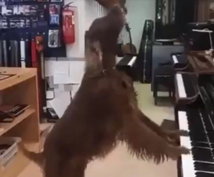 Debout sur ses deux pattes arrière, ce chien nous épate et nous divertit avec sa musique. En effet, il ne fait pas que pousser la chansonnette avec ses hurlements, mais il joue également du piano.