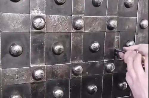 Il est constitué d’une plaque métallique avec plusieurs boutons sous lesquels sont dissimulées les serrures. Pour l’ouvrir, il faudra d’abord trouver les 3 serrures qui seront ouvertes avec une clé spéciale.